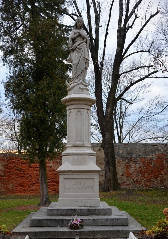 Najokazalsza z nich to figura Matki Bożej Niepokalanego Poczęcia wzniesiona w 1916 r. Postument składa się z kilkustopniowej podstawy, cokołu, kolumny i stojącej na niej figurze Matki Boskiej. Matka Boża stoi na kuli ziemskiej, pod stopami ma półksiężyc i depcze piekielnego węża oplatającego kulę ziemską. Na cokole w prostokątnych płycinach wyryte są inskrypcje w języku łacińskim: od frontu "St. Maria sine labe concepta!" oraz po bokach "Jnterveni pro elero!" i "Ora pro populo!".