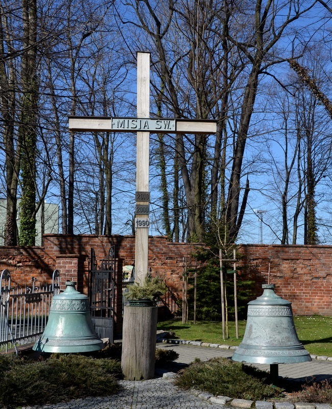 W rogu placu przed kościołem św. Apostołów Filipa i Jakuba stoi prosty drewniany krzyż. Krzyż upamiętnia misje święte jakie tu miały miejsce w latach:1990, 2000 i 2010 roku. Po obu stronach krzyża ustawione są dwa dzwony. Na jednym z dzwonów umieszczony jest napis informujący, że dzwony te ufundowali parafianie z dobrowolnych składek w czasie kiedy proboszczem w tutejszym kościele był ksiądz Adam Bieżanowski. Na dzwonie umieszczona jest również data R.P. 1958/59. Z drugiej strony tego dzwonu wykonana jest płaskorzeźba świętego Józefa i napis "ŚW JÓZEFIE OPIEKUNIE KOŚCIOŁA ŚWIATOWEGO OTOCZ NAS SWOJĄ OPIEKĄ".