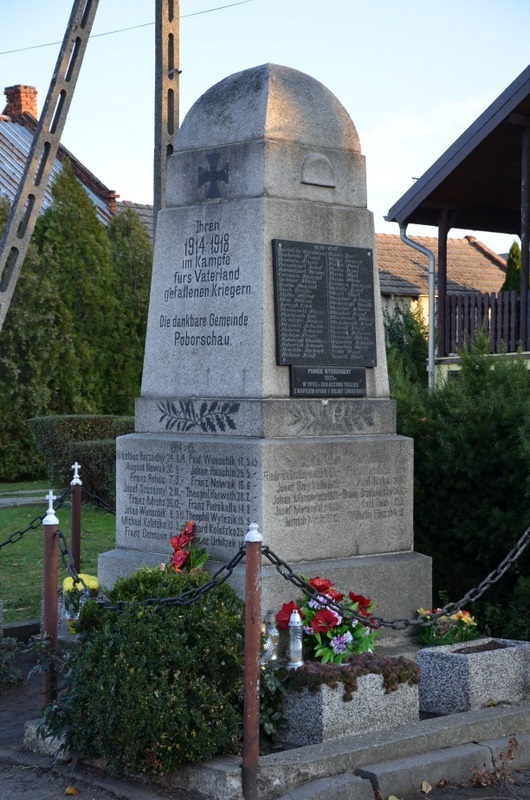 Pomnik upamiętniający poległych mieszkańców wsi podczas I i II wojny światowej usytuowany jest w centrum wsi. Pierwotnie był to pomnik poświęcony poległym w latach 1914 – 1918. Wzniesiony został w 1921 r. Na podstawie pomnika wyryte zostały nazwiska poległych, a na cokole inskrypcja w języku niemieckim. Ponadto na podstawie i cokole widoczne są motywy militarne: Krzyż Żelazny (Eisernes Kreuz) – najwyższe niemieckie odznaczenie wojskowe, żołnierski hełm oraz gałązki wawrzynu – element żałoby i gałązki dębu – symbol męskości. Po II wojnie światowej dołożono tablicę upamiętniającą mieszkańców wsi poległych w latach 1939 – 1945.