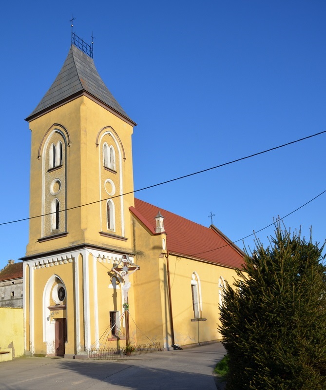 Niewielki kościółek wzniesiony został w 1747 r. Zbudowany jest na planie prostokąta z węższym prezbiterium i przylegającą od frontu do nawy kilkukondygnacyjną wieżą. Wewnątrz na szczególną uwagę zasługuje ołtarz główny z Pietą. W mensie ołtarza umieszczona jest drewniana, polichromowana figura patrona świątyni św. Jana Nepomucena. Postać św. Jana przedstawiona jest w pozycji leżącej, z głową spoczywającej na białej poduszce. Jan ubrany jest w szaty kapłańskie, na głowie ma nałożony biret, lewa ręka ułożona jest wzdłuż lewego boku, a prawa zgięta leży na jego piersiach.