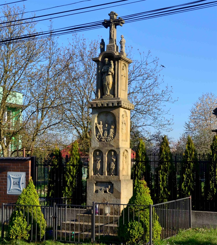 Wykuta w piaskowcu kapliczka słupowa została ufundowana w 1862 r. przez Macieja i Zofię Machnów Zwieńczona jest sceną ukrzyżowania z figurkami św. Maryi i św. Jana. We wnęce w górnej kondygnacji umieszczona jest figura Matki Bożej Różańcowej z Dzieciątkiem, po bokach zaś postacie św. Jadwigi i św. Agaty. Na froncie środkowej kondygnacji umieszczono śr. Trójcę a po bokach św. Zofię i św. Rozalię. Na najniższej kondygnacji znaleźli się św. św. Wojciech, Józef, Andrzej i Maciej. Na cokole wyryto intencję fundatorów.