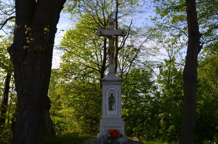 Krzyż przydrożny stoi nieopodal wsi, przy drodze prowadzącej do Twardawy. Na wyższej i węższej części dwustopniowej podstawy inskrypcja w języku niemieckim (po przetłumaczeniu "Św. Janie módl się za nas"). Cokół od frontu posiada niewielką wnękę, w której znajduje się płaskorzeźba św. Jana Nepomucena. Święty w opuszczonej prawej ręce trzyma krzyż i gałązkę palmy, a lewą dłonią zasłania usta – symbol zachowanej tajemnicy spowiedzi. Cokół wieńczy krzyż z figurą ukrzyżowanego Chrystusa, a nad Jego głową poziomy pofałdowany kartusz I.N.R.I.