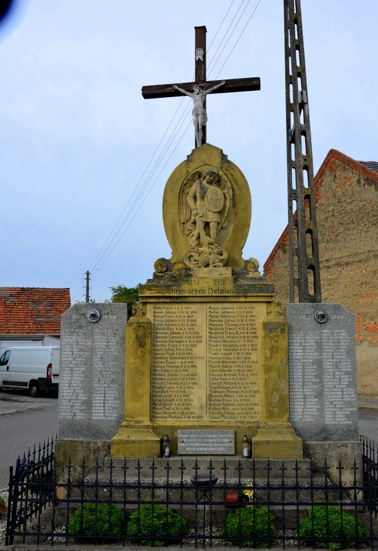 Na przykościelnym cmentarzu, obok wejścia do kościoła pw. św. Katarzyny Aleksandryjskiej stoi kamienny krzyż. Krzyż ufundowała w 1920 roku matka, która podczas I wojny światowej straciła dwóch synów oraz zięcia. Cokół krzyża spoczywa na nieco szerszej podstawie posadowionej na betonowym podwyższeniu. Na podstawie inskrypcja w języku niemieckim. Słabo widoczny napis fundacyjny oraz inskrypcja umieszczone są również na tylnej ścianie cokołu i jego podstawy. Na frontowej ścianie cokołu w prostokątnej płycinie umieszczona jest płaskorzeźba przedstawiająca Pana Jezusa i rannego żołnierza.