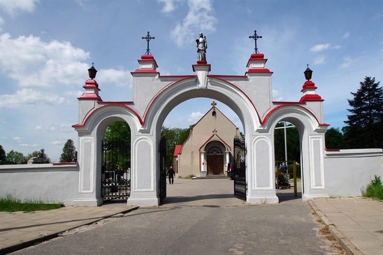 Po przekroczeniu bramy z kutego żelaza znajdujemy się na wprost wybudowanego murowanego kościoła pełniącego także rolę kaplicy przedpogrzebowej. Zastąpił stary modrzewiowy kościółek barokowy z 1643 roku pw. św. Wawrzyńca i św. Józefa. W końcu 1987 roku został podpalony i niestety nie zdołano niczego uratować. Ogień strawił cenne obrazy i organy. Dzięki działaniom ks. proboszcza Stanisława Sochy w końcu lat 80. XX w. stanął w tym samym miejscu obecny obiekt.