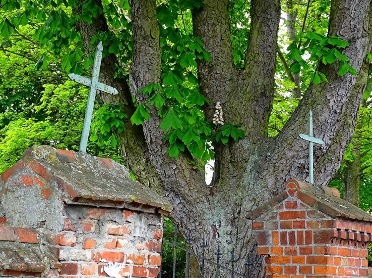 Od XVI w. kościół ten był otoczony cmentarzem i chociaż świątyni już nie ma, nekropolia – mimo, że nie jest użytkowana – trwa nadal. Wprawdzie większość starych grobów została po wojnie zdewastowana, inne ustąpiły miejsca pochówkom nowo przybyłych mieszkańców, nadal jednak odnaleźć tu można kilka przedwojennych perełek sztuki sepulkralnej. W jednej z wydzielonych metalowym płotkiem kwater pochowano ostatniego niemieckiego proboszcza zastrzelonego w kościele przez czerwonoarmistów.
