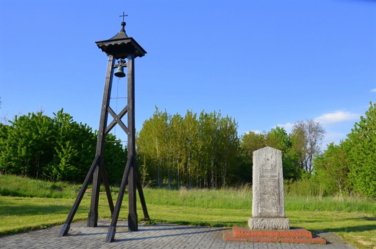 Obok pomnika stoi dzwonnica. Jest to drewniana konstrukcja nakryta czterospadowym daszkiem zwieńczonym krzyżem. Po daszkiem na jarzmie wisi dzwon. Na jego płaszczu zdobionym motywem roślinnym znajduje się płaskorzeźba ukrzyżowanego Chrystusa i napis w języku niemieckim. Dźwięk dzwonu prawdopodobnie obwieszczał śmierć mieszkańca i być może narodziny dziecka.