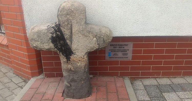 Na rogu restauracji przy ulicy Wiejskiej znajduje się krzyż pokutny.