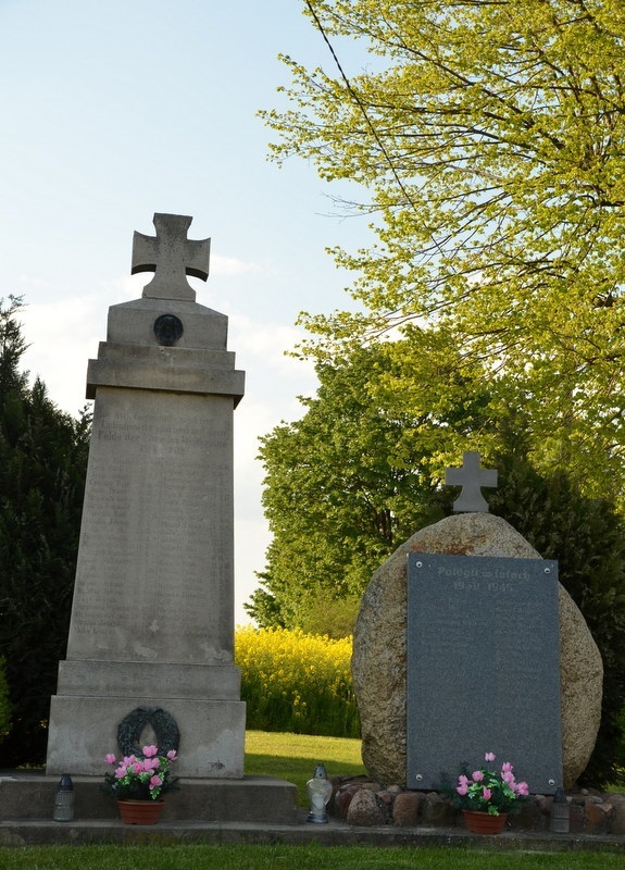 Pomnik poległych w I wojnie światowej wzniesiony został w okresie międzywojennym. Posadowiony jest na dwustopniowym podwyższeniu. Podstawa pomnika dwuczęściowa. Na dolnej wyższej i szerszej jej części znajduje się wieniec z liści dębu. Na podstawie stoi wysoki cokół. Cokół zwęża się ku górze i zakończony prostym gzymsem. Na jego frontowej ścianie wyryta jest inskrypcja w języku niemieckim zawierająca: informację komu pomnik jest przeznaczony oraz datę 1914 – 1918. Poniżej słabo widoczne personalia poległych. Cokół wieńczy dwuczęściowa podstawa z płaskorzeźbą głowy Chrystusa, a na niej Krzyż Żelazny. W jego centrum umieszczona jest litera „W” (inicjał cesarza Wilhelma II), u góry jest data – 1914 (powinna byś korona, a data na dole krzyża).