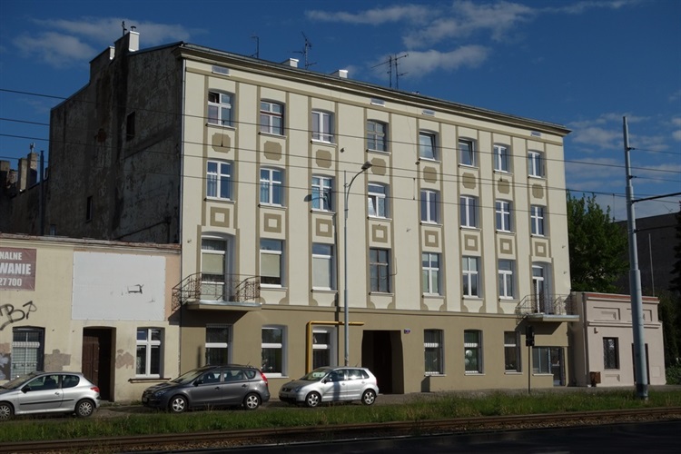 Stojąca przy ul. Pabianickiej 14 (dawniej Szosa Pabianicka), trzypiętrowa kamienica została wzniesiona na początku XX w. W okresie między pod w/w adresem w rożnych latach funkcjonowały m.in.: mechaniczna tkalnia Frydrycha Woltera, mechaniczna piekarnia Edwina Falkenberga, przedsiębiorstwo wykonywania instalacji elektrycznych dla siły i światła Antoniego Sadowskiego.