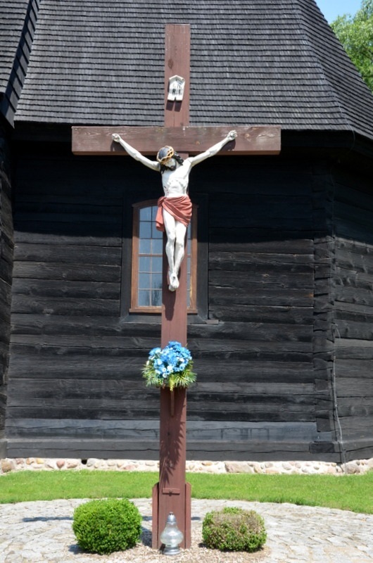 Na terenie kościoła pw. Apostołów Piotra i Pawła zwracają uwagę dwa obiekty małej architektury sakralnej – krzyż i kapliczka. Krzyż stoi pomiędzy wejściem a świątynią. Jest to wysoki, drewniany, prosty krzyż. Na krzyżu centralne miejsce zajmuje figura ukrzyżowanego Chrystusa z koroną cierniową na głowie i przebitym prawym bokiem. Nad głową ukrzyżowanego pionowy pofałdowany kartusz I.N.R.I. Nieco z boku usytuowana jest niepozorna kapliczka. Jest to obiekt wzniesiony z kamienia zakończony półokrągło i dużą wnęką w jej górnej części. Wewnątrz, wśród kwiatów stoi mała figurka.