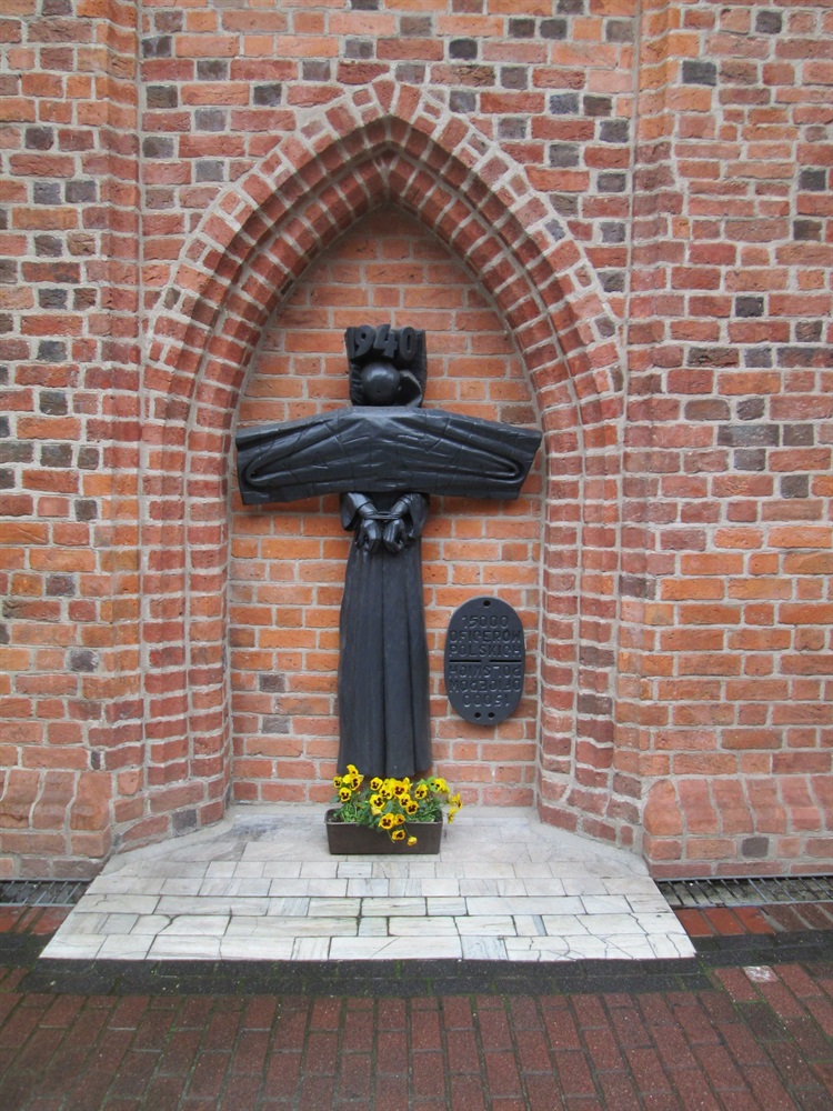 Na zewnętrznej ścianie katedry p.w. św. Mikołaja znajduje się pomnik upamiętniający oficerów polskich, którzy zostali zamordowani w 1940 roku w lasach katyńskich. Pomnik składa z dwóch części: krzyża oraz identyfikatora znanego w wojsku pod nazwą nieśmiertelnika. Na nim widzimy napis: „15000 Oficerów Polskich”. Pionową część krzyża stanowi postać ludzka w okowach, natomiast poziomą napis Katyń. W górnej części umieszczono datę 1940.