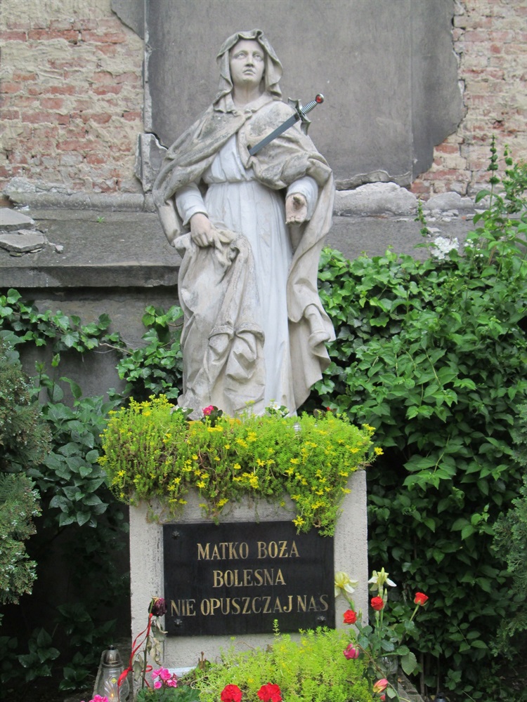 Na dziedzińcu przy kościele p.w. św. Piotra i św. Józefa z Alkantary znajduje się figura Matki Bożej Bolesnej. Święta przedstawiona jest w rozwianej szacie z mieczem utkwionym w sercu. Na cokole umieszczona jest tablica z napisem „Matko Boża Bolesna nie opuszczaj nas”.