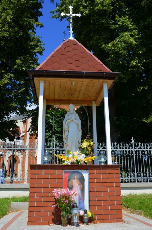 Jest to współczesna kapliczka stojąca obok ogrodzenia kościoła pw. Wniebowzięcia NMP i św. Katarzyny Aleksandryjskiej Dziewicy Męczennicy. Wzniesiona jest na rzucie kwadratu, murowana z czerwonej cegły i nakryta czterospadowym dachem wspartym na czterech słupkach. Dach wieńczy metalowy krzyż z figurką ukrzyżowanego Chrystusa i kartuszem INRI. Pod dachem stoi figura Matki Bożej Różańcowej. Poniżej w prostokątnej płycinie umieszczony jest obraz Jezusa Miłosiernego.
