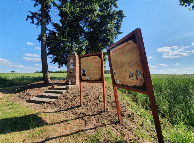 Tablice obok ceglanej kapliczki maryjnej z 1948 r. (dofinansowane ze środków powiatu) pojawiły się za sprawą harcerzy z obornickiego hufca. Stanęły tu w 205 rocznicę potyczki, jaka rozegrała się 10.02.1813 r. pomiędzy oddziałami rosyjskimi, a 4 Pułkiem Piechoty Nadwiślańskiej Dywizji Polskiej osłaniającej wycofujące się spod Moskwy wojska napoleońskie. 140 żołnierzami polskimi dowodził siostrzeniec Tadeusza Kościuszki, płk. Sykstus Estko. Przewaga rosyjska (ok.3500 żołnierzy) była tak znaczna, że Polakom nie pomogła nawet odsiecz gen. Jean Baptiste Girarda. Ponad połowa nadwiślańczyków poległa; dwa dni później wojska Woroncewa zajęły Oborniki, a kolejnego dnia - Poznań.