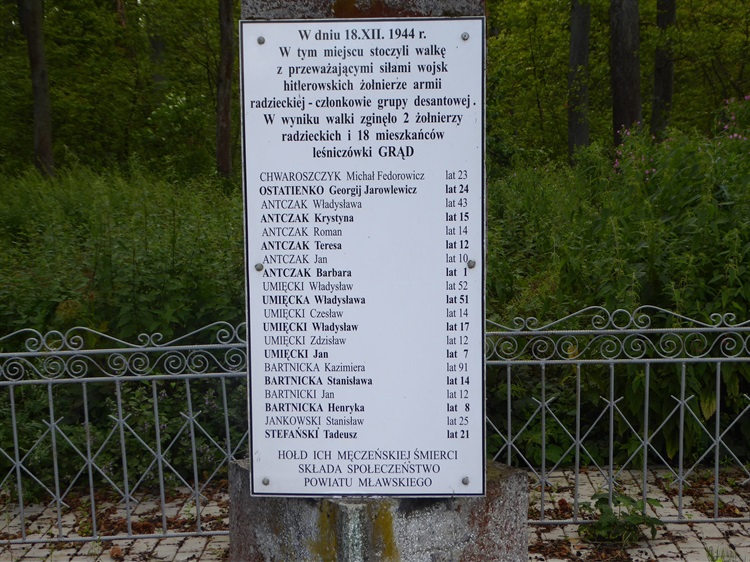 Na północnym skraju rezerwatu „Olszyny Rumockie”, przy drodze Rumoka – Głużek, przy moście stoi pomnik – tablica upamiętniająca smutne wydarzenia z czasów II wojny światowej. W 1944 roku na tym terenie działała grupa spadachroniarzy partyzantów rosyjskich pod dowództwem kapitana Czernikowa. W grudniu tego roku w okolicy grupa ta stoczyła nierówną walkę z Niemcami, w wyniku której zginęli dwaj partyzanci. W odwet za pomoc udzieloną partyzantom radzieckim zostały wymordowane rodziny Antczaków, Umięckich i Bartnickich (łącznie 18 mieszkańców kolonii Grąd w pobliżu Rumok). Wiek niektórych ściska za serce. Mordu dokonali żołnierze wojsk hitlerowskich.