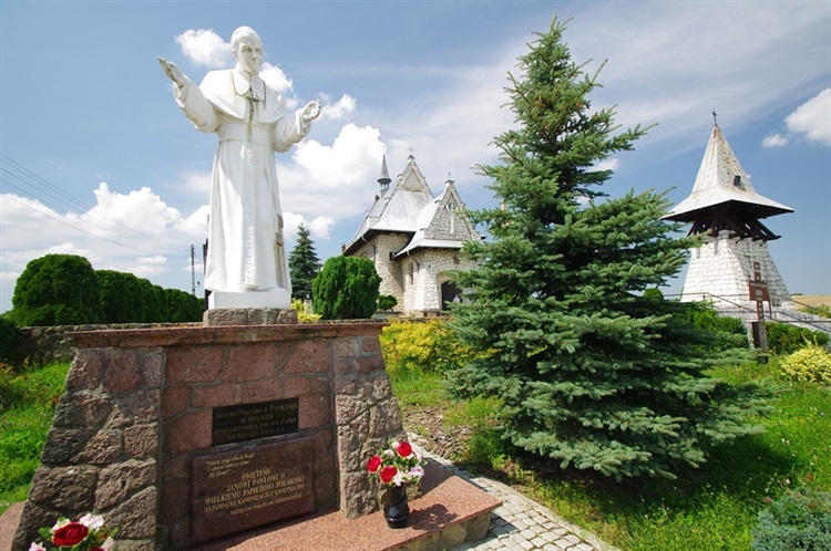 Pomnik Jana Pawła II powstał w roku 1983 dla upamiętnienia drugiej pielgrzymki Ojca Świętego do Ojczyzny po zniesieniu stanu wojennego. Autorem był artysta rzeźbiarz Tadeusz Świerczek (1916-2003). Oprócz tego, dla tutejszego kościoła wykonał figury św. Antoniego, św. Franciszka, św. Józefa, św. Piotra, płaskorzeźby przedstawiające Zwiastowanie NMP i Tajemnicę Różańca oraz narzut na portalu świątyni Chrystus- Serce Pana Jezusa. Rzeźba przedstawia papieża w charakterystycznej dla siebie pozie. Wszystkie dzieła artysty zostały wykonane ze sztucznego kamienia.