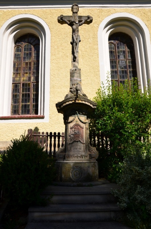 Imponująco wygląda ozdobny cokół. Na ścianie frontowej wyryta jest inskrypcja, a powyżej płaskorzeźba przedstawiająca scenę spowiedzi. Na ścianie bocznej cokołu relief przedstawiający świętych: Piotra i Pawła. Krzyż wieńczący cokół posadowiony jest na stopce, na której wykonany jest relief przedstawiający Trójcę Świętą. Na krzyżu figura ukrzyżowanego Chrystusa i kartusz INRI.
