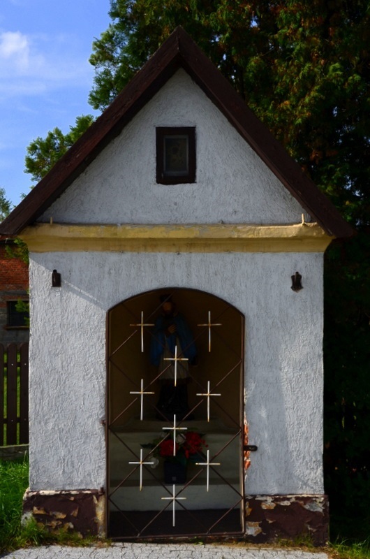 Wewnątrz kapliczki na kilkustopniowej podstawie stoi ludowa, drewniana figura św. Jana Nepomucena. Jan ubrany w szaty kapłana w prawej ręce przy piersi trzyma krzyż ,a w opuszczonej lewej ręce zamkniętą księgę.