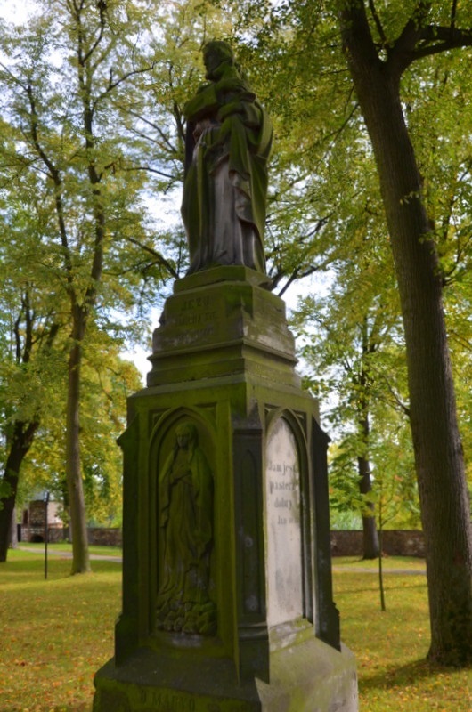 Rzeźba przedstawiająca Pana Jezusa stoi obok kościoła Wniebowzięcia NMP. Figura wieńczy cokół posadowiony na dwustopniowej podstawie ustawionej na kilkustopniowym podwyższeniu. Ściany cokołu posiadają prostokątne płyciny, w których wyryte są inskrypcje, a w płycinie ściany frontowej płaskorzeźba Matki Bożej. Postać Pana Jezusa stoi dodatkowo na małym cokoliku, na którym wyryta jest inskrypcja o treści: JEZU ZMIŁUJ SIĘ NAD NAMI. Pan Jezus przedstawiony jest jako dobry pasterz trzymający owieczkę. Postument datowany jest na koniec XIX wieku.