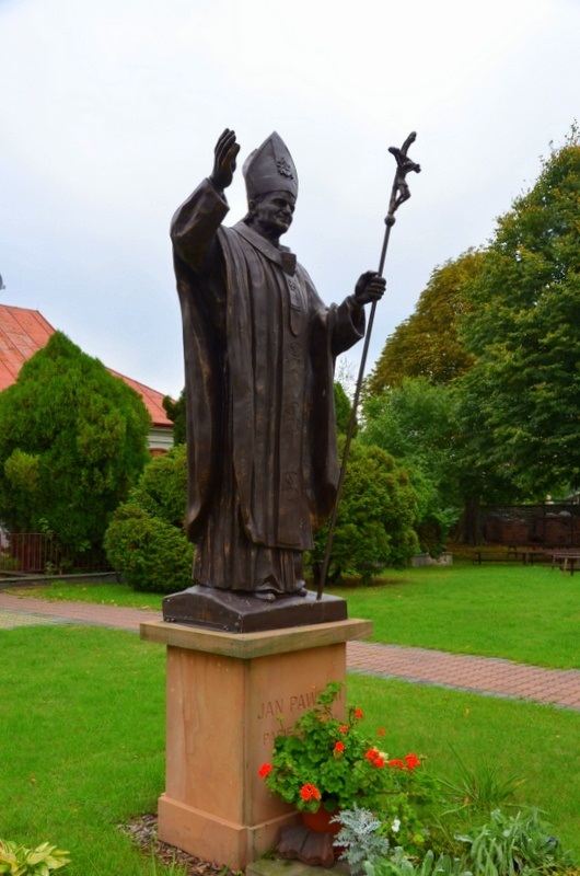Postument posadowiony jest na poziomie kościoła pw. Narodzenia NMP. Na prostym cokole z inskrypcją stoi sylwetka św. Jana Pawła II. Jan Paweł II przedstawiony jest z tradycyjnym pastorałem trzymanym w lewej ręce. Jest to pastorał z lekko wygiętym krzyżem i ukrzyżowanym Chrystusem, scheda po papieżu Pawle VI.