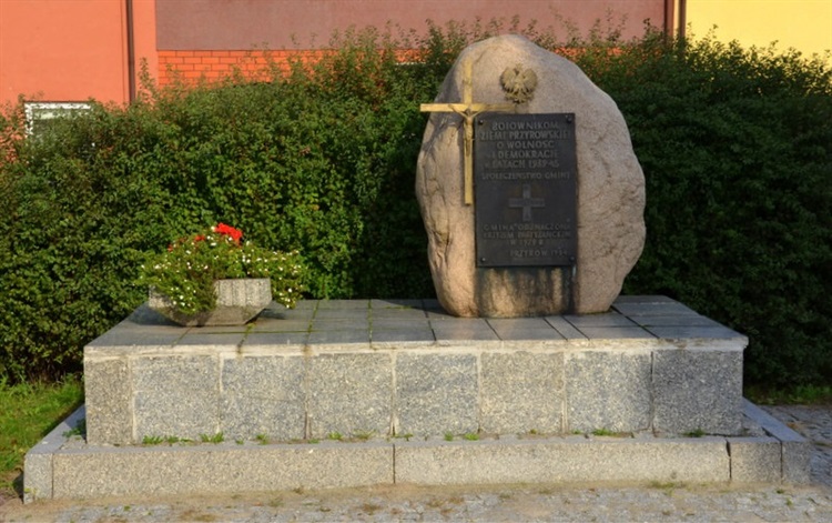 Jest to głaz z tablicą pamiątkowa posadowiony na dwustopniowym podwyższeniu. Pomnik upamiętnia mieszkańców poległych podczas II wojny światowej. Na tablicy pamiątkowej umieszczono napis "BOJOWNIKOM ZIEMI PRZYROWSKIEJ O WOLNOŚĆ I DEMOKRACJĘ w LATACH 1939 – 45 / SPOŁECZEŃSTWO GMINY" oraz "GMINA ODZNACZONA KRZYŻEM PARTYZANCKIM W 1979 R / PRZYRÓW 1984". Pomiędzy napisami krzyż z orzełkiem w centrum i napisem na ramionach krzyża "ZA POLSKĘ WOLNOŚĆ I LUD". Obok tablicy umieszczony jest krzyż z figurką ukrzyżowanego Chrystusa, a nad tablicą orzeł. Pomnik stoi na rynku i został odsłonięty w 1984 r.