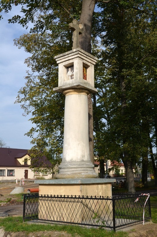 Przy wejściu na aleję prowadzącą do Sanktuarium Świętej Anny stoi wysoka kolumna, na której umieszczona jest kapliczka. Zwężająca się ku górze kolumna posadowiona jest na prostej podstawie. Kapliczka wieńcząca kolumnę wykonana jest na rzucie kwadratu, jest murowana, zakończona wielowarstwowym gzymsem i nakryta czterospadowym daszkiem z krzyżem na szczycie. Na krzyżu figurka ukrzyżowanego Chrystusa. W ścianach kapliczki wykonane są prostokątne wnęki, w których umieszczone są obrazy z wizerunkami świętych, w tym obraz Matki Boskiej Częstochowskiej z Dzieciątkiem.