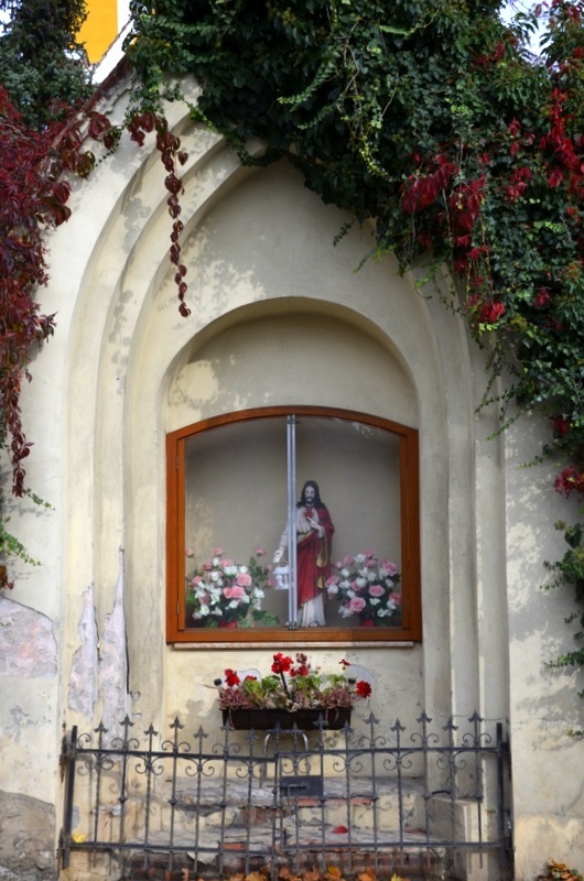 Od ul. 1 Maja tj. od strony południowej w mur wbudowana jest kapliczka, której wzniesienie datuje się na XIX wiek. W przeszklonej wnęce kapliczki umieszczona jest figura Pana Jezusa. W wizerunku tym Pan Jezus przedstawiony jest z sercem na wierzchu. Jego gorejące serce oplecione jest cierniem, a na jego szczycie umieszczony jest krzyżyk.