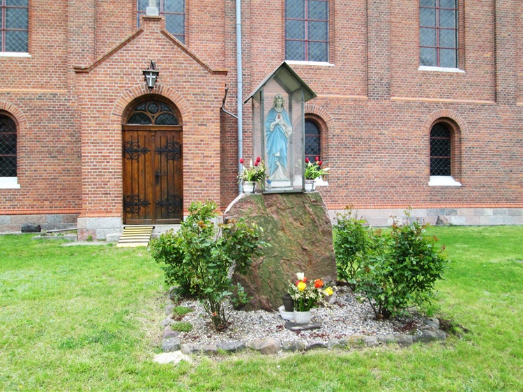 Kapliczka z figurą Matki Bożej znajduje się przy kościele p.w. Niepokalanego Serca Najświętszej Maryi Panny. Figura Matki Bożej w biało-turkusowej szacie umieszczona jest w szklanej kapsule krytej dwuspadowym dachem.