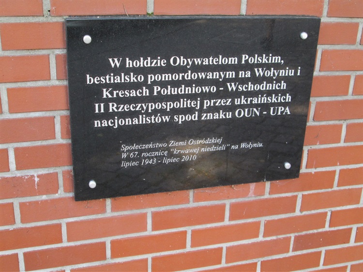 Tablica pamiątkowa upamiętniająca pomordowanych na Wołyniu i Kresach Południowo-Wschodnich znajduje się na murze przy wejściu na stary cmentarz katolicki przy ul. Stefana Czarnieckiego. Mordu dokonały w lipcu 1943 roku nacjonalistyczne ukraińskie oddziały spod znaku OUN-UPA. Tablica ufundowana została przez Społeczeństwo Ziemi Ostródzkiej w lipcu 2010 roku w 67. Rocznicę „krwawej niedzieli” na Wołyniu.
