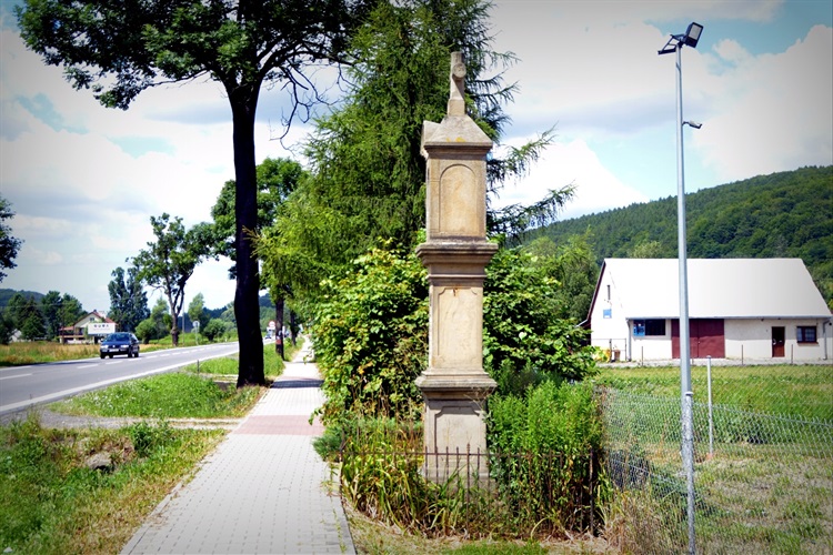 Kapliczka stoi przy drodze krajowej nr 73. Ufundował ją w 1895 r. Jan Krzyżak. Jest to prosta, trzykondygnacyjna kamienna kapliczka słupowa zwieńczona czterospadowym dachem zakończonym krzyżem. Na frontowej ścianie najwyższej kondygnacji wykonana jest przeszklona wnęk z umieszczoną wewnątrz figurką Matki Bożej Różańcowej. W również przeszklonej wnęce w środkowej kondygnacji znajduje się drewniana rzeźba przedstawiająca św. Antoniego Padewskiego z 1971 r. Poprzednio w tej wnęce mieścił się figura św. Jana Nepomucena. Na najniższej kondygnacji zwyczajowo została zamieszczona intencja fundatora o treści: „KU CZCI N.M.P. RÓŻAŃCOWEJ POSTAWIŁ TĘ FIGURĘ JAN KRZYŻAK w r.p. 1895”. Na bocznych powierzchniach, poza płytkimi blendami nie występują żadne zdobienia.