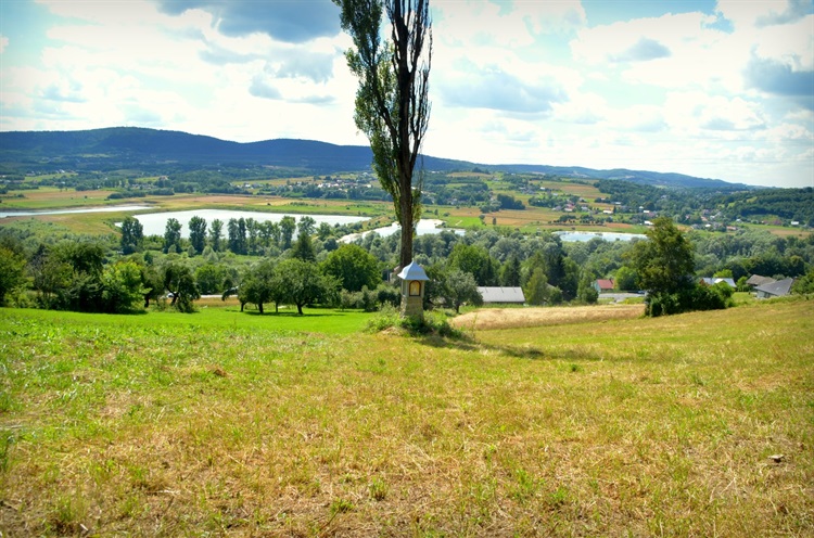Kapliczka została zaprojektowana i wybudowana wraz ze znajdującym się w pobliżu cmentarzem wojennym nr 218. Pierwotnie była punktem orientacyjnym przy drodze prowadzącej na cmentarz. Dziś dawna droga jest zatarta, a kapliczka znajduje się pośrodku pól uprawnych, pod wysoką włoską topolą. Kapliczka wykonana jest w formie kwadratowego słupa wymurowanego z łamanego kamienia z betonową głowicą z wnękami, z których trzy ozdobione są malowidłami autorstwa krakowskiego artysty malarza Alfonsa Karpińskiego. Kapliczka przykryta jest metalową kopułą zwieńczoną krzyżem.