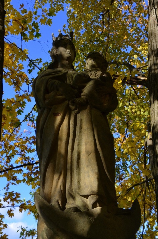 Przed kaplicą św. Anny stoją dwa pomniki tzw. małej architektury sakralnej. Postawione zostały prawdopodobnie w XIX lub na początku XX wieku. Po prawej stronie znajduje się kamienna rzeźba przedstawiająca Matkę Bożą z Dzieciątkiem. Matka Boża jak i Dzieciątko na głowach mają nałożone korony. Rzeźba wieńczy cokół posadowiony na niskiej podstawie i otoczony niskim metalowym ogrodzeniem.
