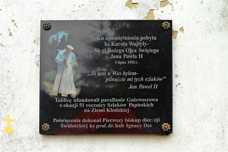 Tablica upamiętniająca pobyt Karola Wojtyły na Ziemi Kłodzkiej znajduje się na elewacji kościoła pod wezwaniem św. Michała Archanioła w Gniewoszowie. Na kamiennej tablicy widnieje wizerunek papieża wędrującego po górach oraz napis: „ Ku upamiętnieniu pobytu ks. Karola Wojtyły - Sługi Bożego Ojca Świętego Jana Pawła II. 5 lipiec 1955 r. «Ja tam u Was byłem - pilnujcie mi tych szlaków» Jan Paweł II. Tablicę ufundowali parafianie Gniewoszowa z okazji 51 rocznicy Szlaków Papieskich na Ziemi Kłodzkiej. Poświęcenia dokonał Pierwszy biskup diecezji Świdnickiej ks prof. dr. hab Ignacy Dec ”.