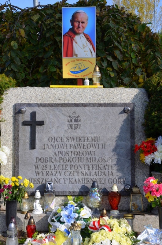 Pomnik upamiętniający 25 rocznicę pontyfikatu papieża Jana Pawła II stoi przy Rondzie Niepodległości. Jest to granitowa płyta posadowiona na również granitowej podstawie. Na płycie tablica z krzyżem, herbem papieskim oraz inskrypcją "OJCU ŚWIĘTEMU JANOWI PAWŁOWI II / APOSTOŁOWI DOBRA POKOJU MIŁOŚCI / W 25 LECIE PONTYFIKATU / WYRAZY CZCI SKŁADAJĄ MIESZKAŃCY KAMIENNEJ GÓRY". Nad kamienną płytą zdjęcie Jana Pawła II. Pomnik poświęcony został 16.X.2003 r.