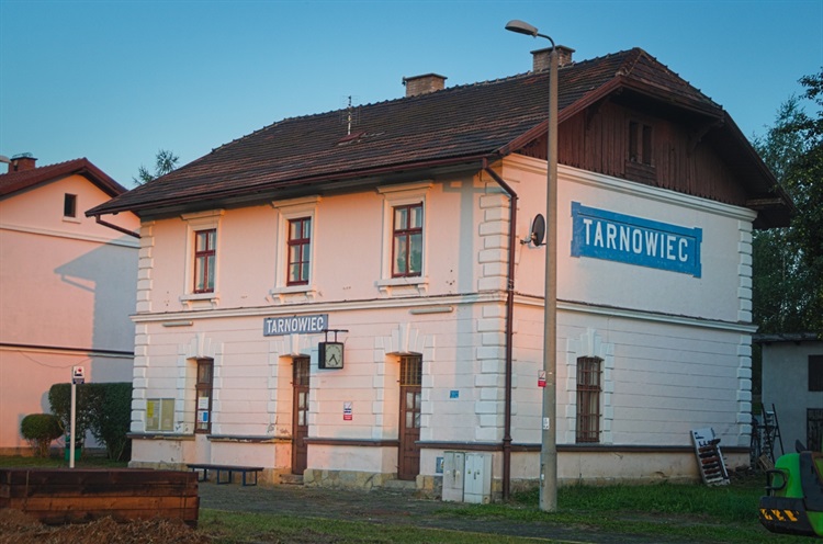 Dworzec kolejowy został wybudowany w roku 1884 wraz z budową linii kolejowej oznaczonej współcześnie numerem 108. Jest to typowy budynek dworcowy, charakterystyczny dla monarchii austro-węgierskiej: murowany, dwukondygnacyjny z niewielkim poddaszem krytym dwuspadowym dachem, boniowanymi ścianami niższej kondygnacji, ozdobnymi narożami, obramowaniami okien i drzwi oraz gzymsem pomiędzy kondygnacjami. Boczne ściany poddasza obite drewnem w stylu wzorowanym na tyrolskim. Na parterze funkcjonowała niewielka poczekalnia oraz pomieszczenia biurowe. Piętro pełniło funkcje mieszkalne. Obecnie na parterze funkcjonują lokale handlowo-usługowe