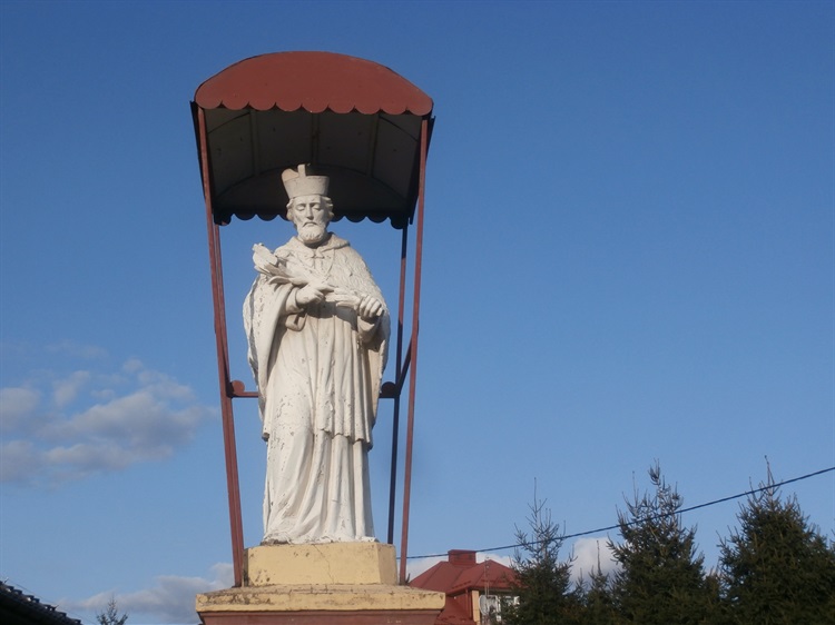 Kamienna figura św. Jana Nepomucena. Na cokole tablica z napisem "Św. Janie / Nepomucenie / módl się / za nami. / Wystawiono 1909 roku"