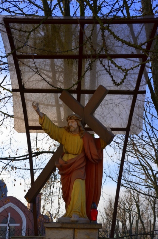 Dwie rzeźby ustawione zostały w połowie XX wieku nieopodal Sanktuarium Miłosierdzia Bożego. Po prawej stronie stoi prosty cokół, na którym umieszczona jest figura Chrystusa dźwigającego krzyż. Na frontowej ścianie cokołu data postawienia postumentu oraz napis w języku łacińskim "SURSUM CORDA / 1950". Druga figura umieszczona jest po lewej stronie sanktuarium. Na wysokim cokole napis "AVE MARIA" i data 1953. Cokół wieńczy figura Matki Bożej Niepokalanego Poczęcia.