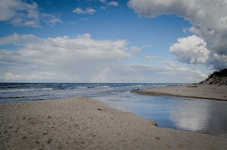 Polskie rzeki, które mają naturalne ujścia do Bałtyku można policzyć na palcach. Jedną z nich jest Czerwona. Brak falochronów i urządzeń regulacyjnych sprawa, że ujście Czerwonej jest miejscem niezwykle malowniczym. Dopływając do plaży rzeka wyłania się spośród gęstych zarośli. Na samej plaży jest na tyle płytko, że można przejść na drugi brzeg nie mocząc kolan, a niekiedy nawet suchą stopą. Nazwa Czerwona została urzędowo nadana w 1948 r. Wcześniej rzeka nosiła nazwę Wonne Bach. Niekiedy woda przybiera rdzawo-czerwony kolor, co przypisuję się zabarwianiu wody przez zawarte w glebie minerały.