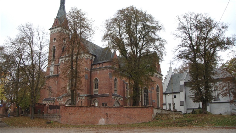 Kościół neogotycki (1909-1914). Kaplica - pozostałość dawnego kościoła murowanego (XV w.); korpus kościoła rozebrano (1909).