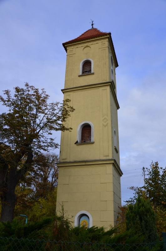 Wieża alarmowa wzniesiona została około 1890 r. Pierwotnie pełniła funkcję dzwonnicy. Jest to obiekt wzniesiony na planie kwadratu, murowany, otynkowany i nakryty czterospadowym dachem. Wieża jest trzykondygnacyjna, poszczególne kondygnacje przedzielone gzymsami. Wejście do wieży na pierwszej kondygnacji zakończone półokrągło, a w dwóch półokrągło zamkniętych wnękach mozaikowe obrazy świętych ( jednym z nich jest św. Krzysztof).