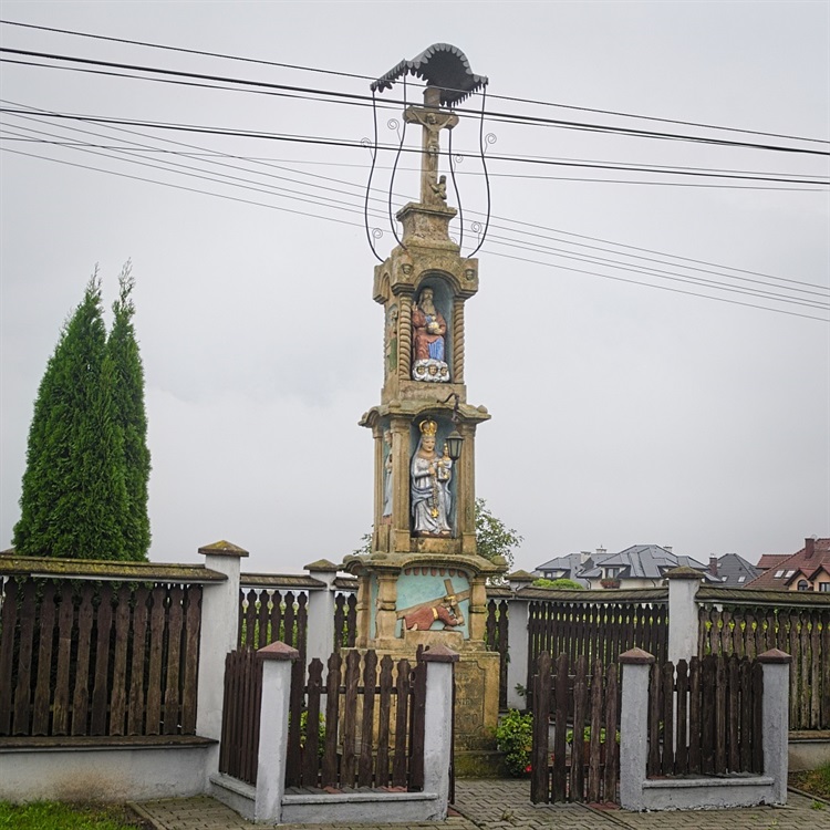 Trzykondygnacyjna, wykuta w piaskowcu kapliczka zwieńczona jest krucyfiksem przykrytym metalowym baldachimem. Pod krzyżem znajduje się klęcząca postać Marii Magdaleny. Głęboką wnękę najwyższej kondygnacji zajmuje figura Boga Ojca siedzącego na chmurach z ręką uniesioną w geście błogosławieństwa. Po bokach znajdują się wizerunki św. Barbary i anioła dmącego w trąbkę. Na kondygnacji środkowe we frontowej wnęce znajduje się siedząca figura Matki Bożej Różańcowej z Dzieciątkiem, zaś w bocznych wnękach figury św. Katarzyny i niezidentyfikowanej świętej. Płaskorzeźby na najniższej kondygnacji przestawiają Chrystusa upadającego pod krzyżem, św. Józefa oraz św. Antoniego.