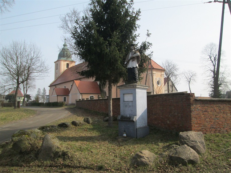 Figura św. Jana Nepomucena znajduje się przy kościele p.w. Nawiedzenia NMP. Umieszczona jest na wysokim cokole. Na cokole widoczna jest tabliczka z napisem w języku łacińskim: „Sct. Johanne Nepomucene. Ora pro nobis”, co w tłumaczeniu znaczy: „Św. Janie Nepomucenie. Módl się za nami”. Jest tam również data 1874, będąca zapewne rokiem ufundowania figury.