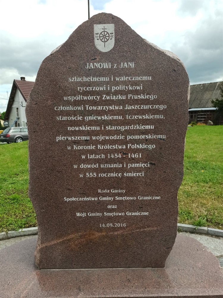 Pomnik ustawiony w dowodzie uznania i pamięci w 555 rocznicę śmierci Jana z Jani, szlachetnego i walecznego rycerza z tych ziem. Polityka, współtwórcy Związku Pruskiego, członka Towarzystwa Jaszczurczego, starosty gniewskiego, tczewskiego, nowskiego i starogardzkiego ponadto był pierwszym wojewodą pomorskim w Koronie Królestwa Polskiego w latach 1454 -1461. Był rycerzem holenderskiego pochodzenia o nazwisku von der Jane.
