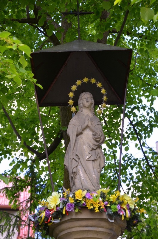 Wolnostojąca figura usytuowana jest niedaleko kościoła pw. Świętych Apostołów Filipa i Jakuba. Kamienna rzeźba Matki Bożej stoi na głowicy wysokiej kolumny posadowionej na niskiej podstawie. Nad postacią czterospadowy daszek wykonany z blachy i zwieńczony krzyżem. Matka Boża Niepokalana stoi na kuli ziemskiej, przedstawiona jest z dłońmi złożonymi do modlitwy i gwiezdną aureolą nad głową.