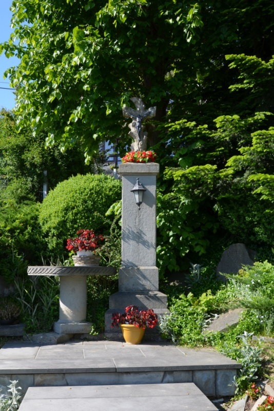 Krzyż wieńczy wysoki, prosty cokół posadowiony na kilkustopniowej podstawie. Jest to krzyż w formie konaru drzewa, na którym umieszczona została figurka ukrzyżowanego Chrystusa. Krzyż z konaru drzewa to kolejna kapliczka nawiązująca do powstania miejscowości na tzw. surowym korzeniu, gdyż wcześniej należało wykarczować las.