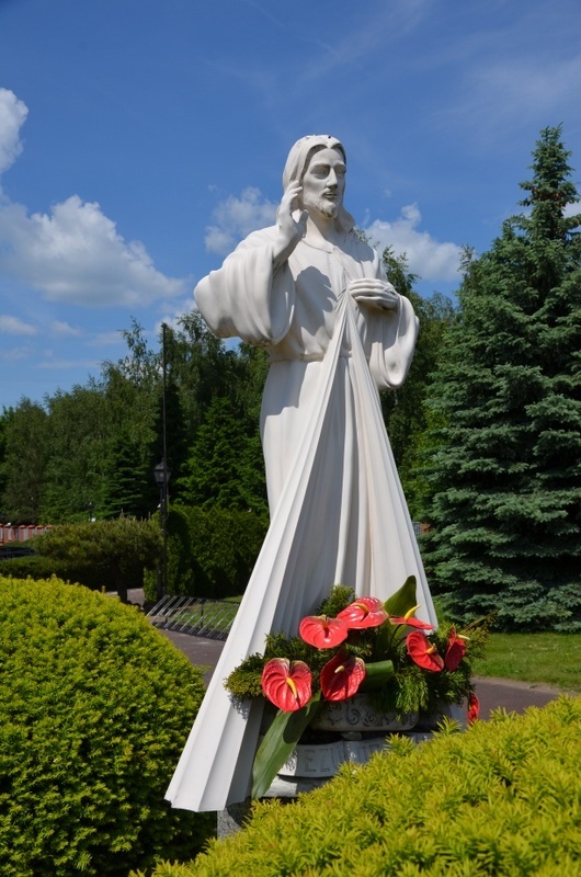 Figura Chrystusa Miłosiernego stoi na placu przed kościołem któremu patronuje. Rzeźba wieńczy prosty cokół posadowiony na niskiej podstawie. Jest to figura Chrystusa Miłosiernego wykonanego na podstawie obrazu namalowanego wg projektu siostry Faustyny Kowalskiej, której 22 lutego 1931 roku w celi płockiego klasztoru w tej postaci ukazał się Pan Jezus. U podnóża figury na poziomej pofałdowanej wstędze umieszczony jest napis „JEZU UFAM TOBIE”. Taki sam napis umieszczony jest nad wejściem do kościoła.