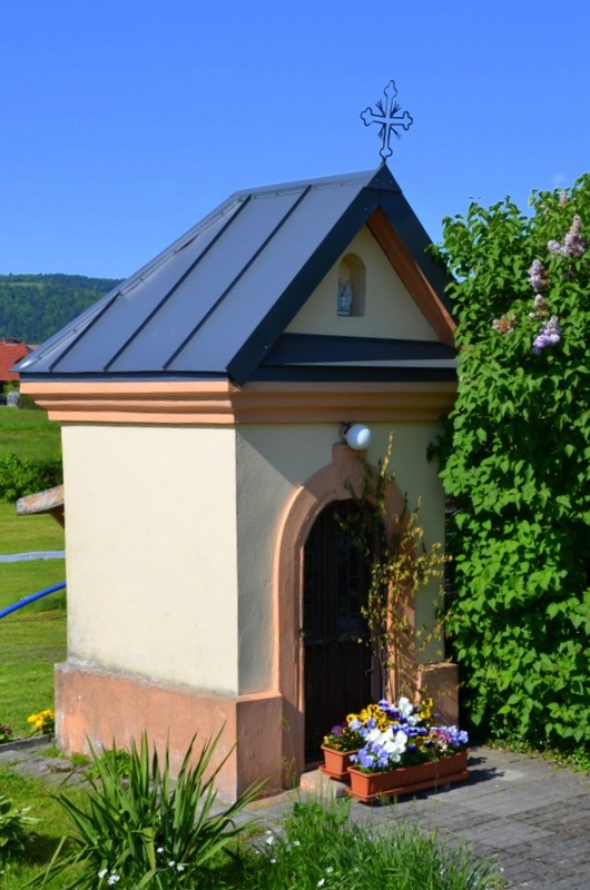 Kapliczka typu domkowego stoi na skraju drogi w przysiółku Wądołek. Wzniesiona została w 1870 r. Jest to kapliczka murowana na rzucie prostokąta, otynkowana i nakryta dwuspadowym dachem z ażurowym krzyżem na szczycie. Nad półokrągło zamkniętym wejściem do kapliczki wykonana jest wnęka zamknięta łagodnym łukiem. We wnęce umieszczona jest kompozycja rzeźbiarska przedstawiająca Świętą Rodzinę. W kapliczce między innymi znajduje się płaskorzeźba przedstawiająca ukrzyżowanego Chrystusa oraz rzeźba przedstawiająca Chrystusa przy kolumnie. Kapliczka niedawno została odnowiona.
