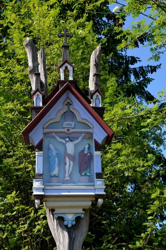 Kapliczka znajduje się na terenie prywatnej posesji w przysiółku Kachniarze-Dział. Jest to piękne snycerskie dzieło wykonane w 1900 r. W przeszklonej wnęce kapliczki umieszczona została ludowa kompozycja rzeźbiarska przedstawiająca Bożą Mękę. Centralne miejsce zajmuje krzyż z figurką ukrzyżowanego Chrystusa. Pod krzyżem stoją dwie postacie: Matka Boska Bolesna i św. Jan Ewangelista. Pierwotnie kapliczka zawieszona była na drewnianym krzyżu. Obecnie zawieszona jest na ściętym konarze drzewa.