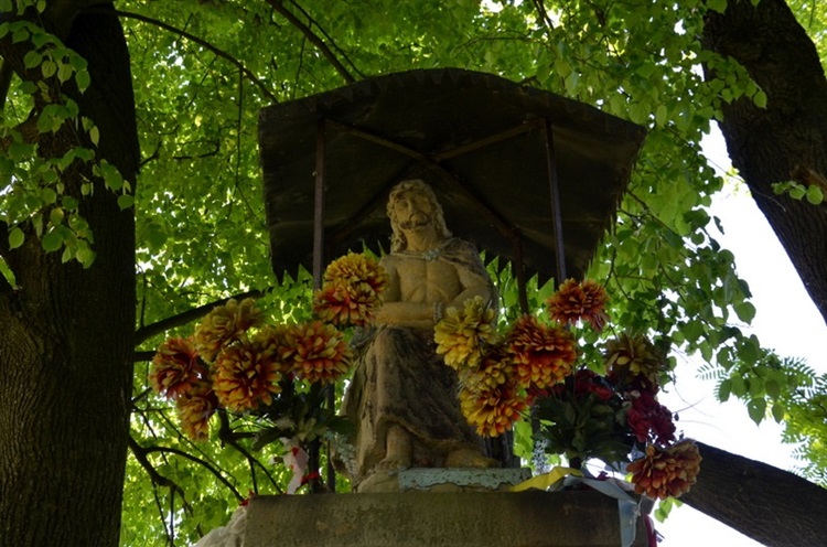 Rzeźba usytuowana jest pomiędzy dwoma drzewami, na niewielkim wzniesieniu nad drogą Mystków – Cieniawa. Figura wieńczy cokół posadowiony na trzystopniowej podstawie. Na trzecim stopniu podstawy wyryty jest napis fundacyjny - „ZA USTARANIE POSTAWIENIE TEJ FIGURY / MICHAŁA HEBDY MARYI ŻONY / R 1936 P”. Cokół zakończony dużym gzymsem zdobionym motywami roślinnymi. W ścianach cokołu półokrągło zakończone płyciny, w których znajdują się płaskorzeźby świętych. W płycinie w ścianie frontowej widnieje płaskorzeźba Świętej Rodziny, w ścianie bocznej uszkodzona płaskorzeźba przedstawiająca Michała Archanioła strącającego nogami do piekła Lucyfera. Na drugie ścianie bocznej płaskorzeźba jest zniszczona i nie można rozpoznać postaci. W płycinie tylnej ściany cokołu wyryte zostały krzyż, kotwica i serce – oznaczające trzy cnoty teologiczne: wiarę, nadzieję i miłość. Cokół wieńczy postać Chrystusa Frasobliwego. Nad postacią daszek wykonany z blachy i wsparty na czterech prętach.