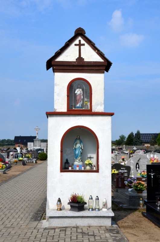 Kapliczka stoi na terenie cmentarza. Kapliczka jest obiektem murowanym na planie prostokąta, dwuczęściowa i nakryta dwuspadowym daszkiem krytym dachówką. Pierwsza kondygnacja kapliczki jest większa, a w ścianie frontowej posiada przeszkloną wnękę zakończoną łagodnym łukiem. Wewnątrz centralne miejsce zajmuje figura Matki Bożej Niepokalanego Poczęcia. Matka Boża stoi na kuli ziemskiej depcząc łeb piekielnego węża trzymającego w paszczy jabłko. Druga kondygnacja również posiada przeszkloną wnękę, w której stoi figura Pana Jezusa z gorejącym sercem na wierzchu. W trójkątnym szczycie nad wnęką widnieje symbol krzyża.